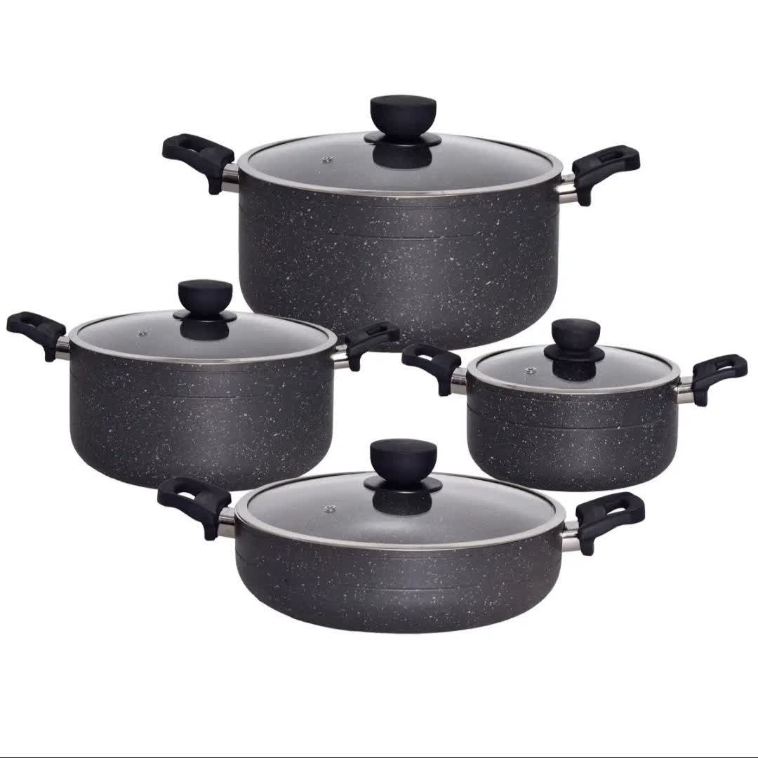 سرویس قابلمه 8 پارچه گرانیت یونیک مدل UN8194 با طراحی رویال، پوشش گرانیت نچسب، دربهای شیشهای مقاوم و دوام بالا، انتخابی بینظیر برای آشپزخانههای مدرن است.